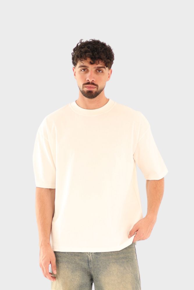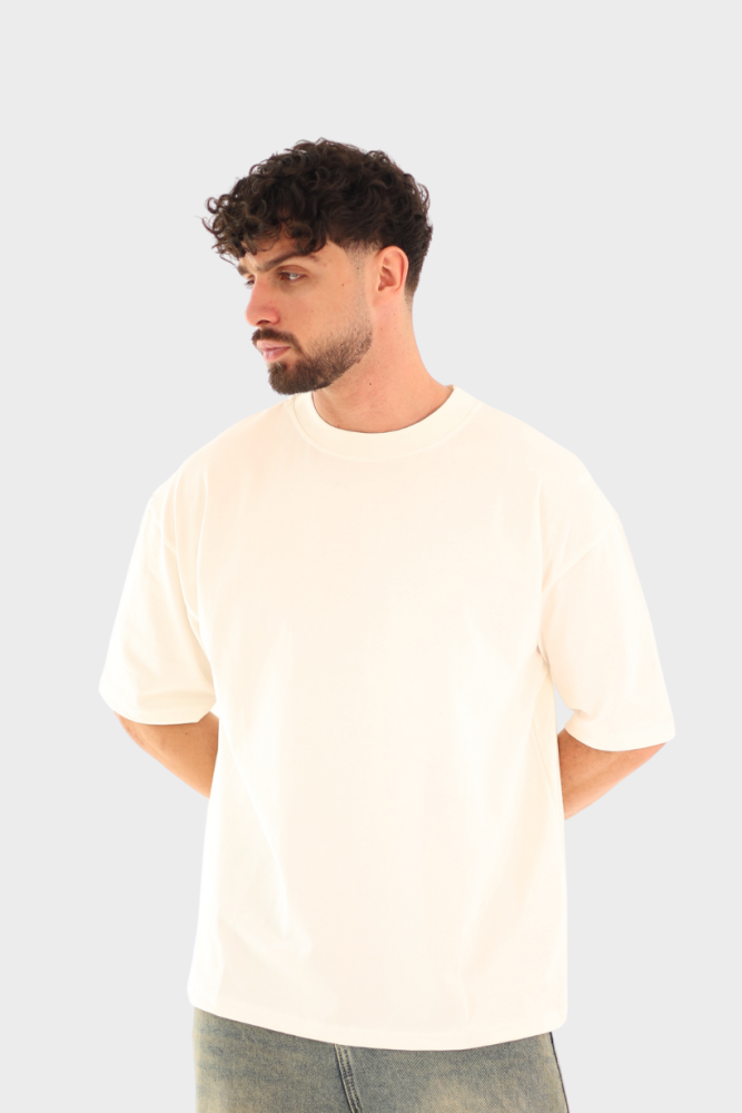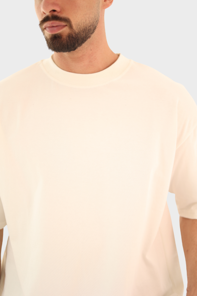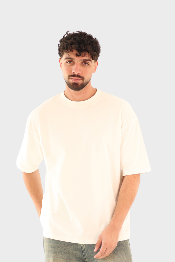 تيشيرت بيسك أوفرسايز بلون آيفوري (Ivory)، قطعة أساسية تعكس البساطة والأناقة.